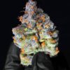 The cured buds of this strain are bright neon green with yellow pistils and a sprinkling of trichomes that easily flake off, so be careful not to handle the buds too much.